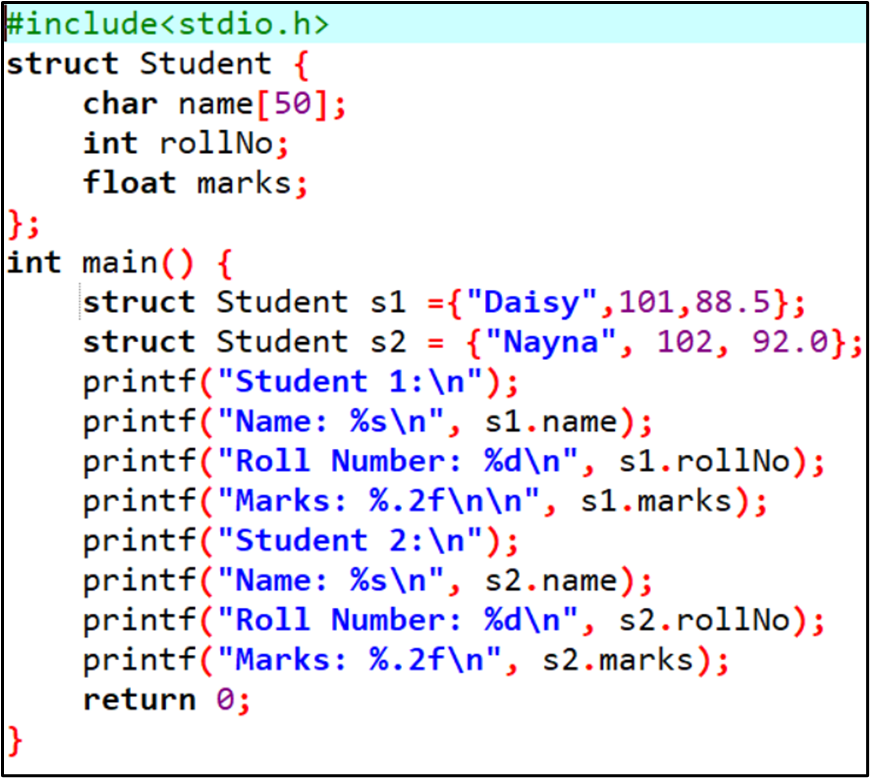 Here, “John” is assigned to std1.name, 1 is assigned std1.roll, 20 is assigned to std1.age and 1500.00 is assigned to std1.fees
