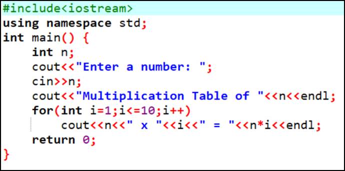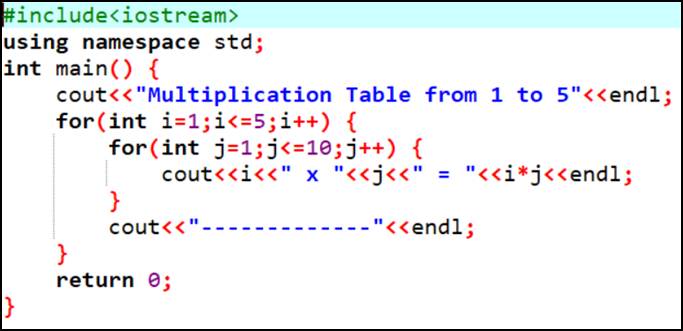 9. Write a C++ program to print multiplication table from 1 to 5.