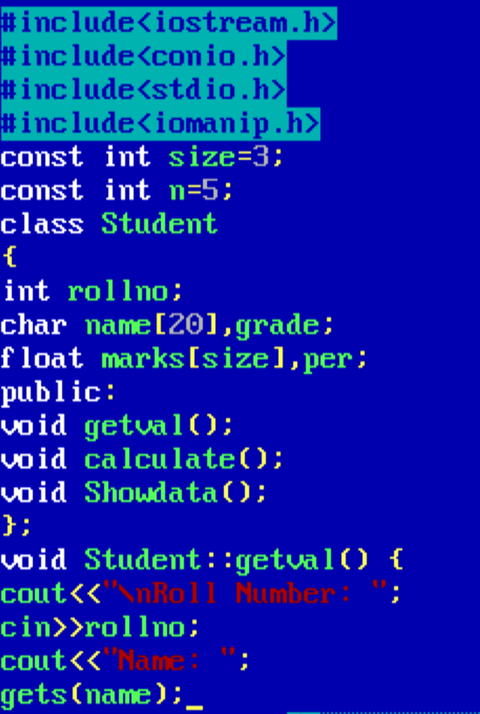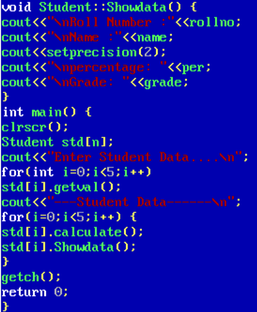getval() function to accept values for rollno, name and marks to calculate total. Showdata() function display all the data.