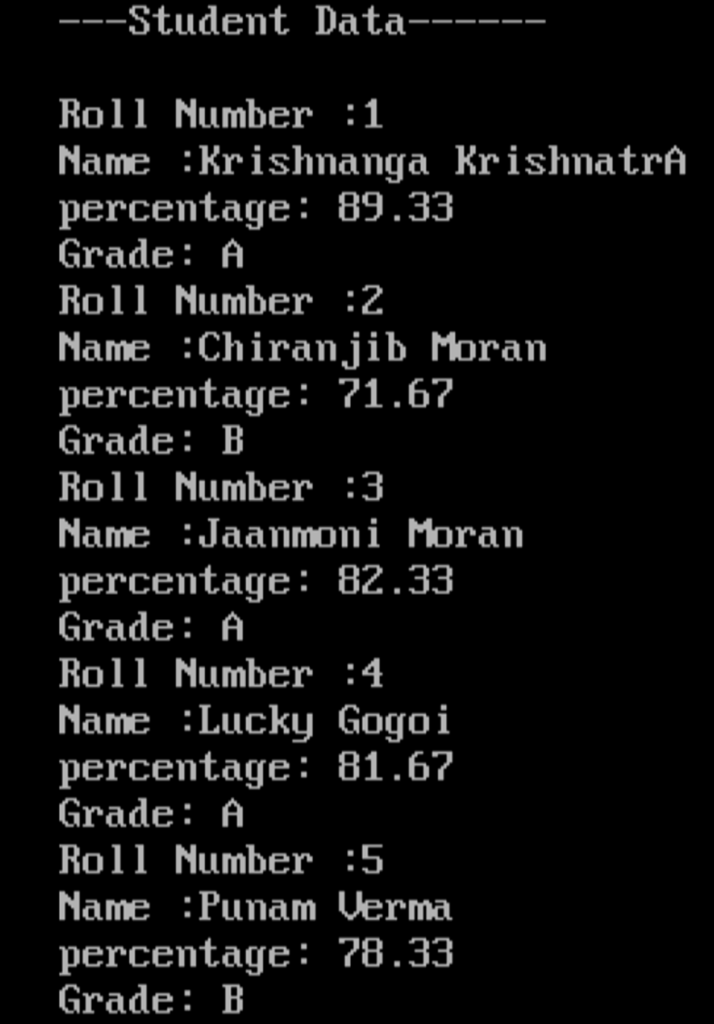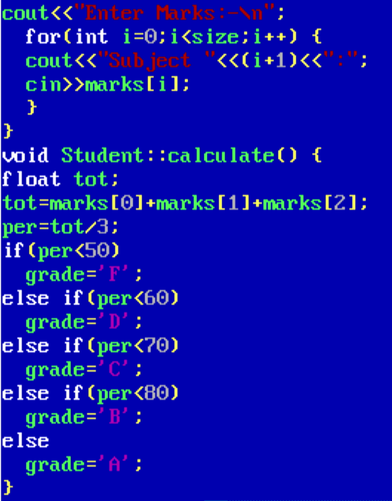 15. Write a C++ program to simulate result preparation system for 3 students. The data available for each student includes rollno, name and marks in 3 subjects. Calculate percentage and grade. The percentage marks are the average marks and the grade is calculated as follows: