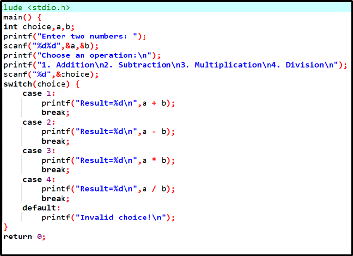 stdio.h: This is the standard input-output header in C. It contains functions for data input and output, such as printf() for output and scanf() for input.