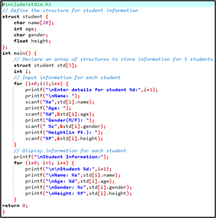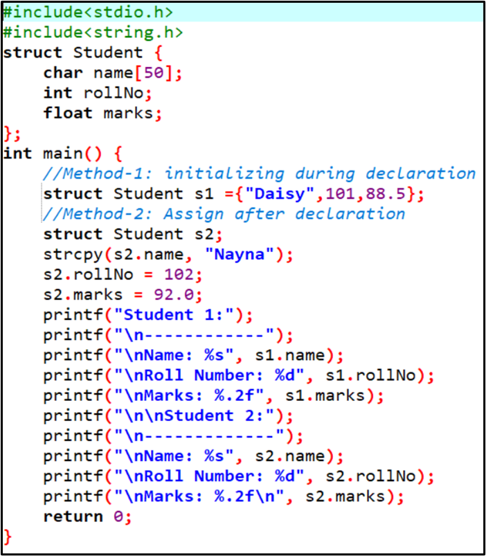 name, rollNo, marks: These are the members of the structure, representing different attributes of a student. They can be of various data types.