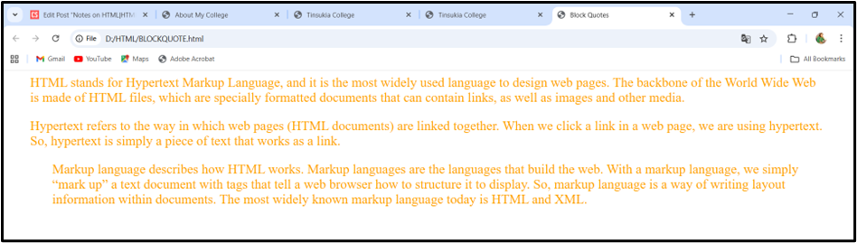 HTML stands for Hypertext Markup Language. It is the standard language used to create web pages. It is the most widely used language to design web pages. HTML is the basic building block of the web. It is used for defining the structure of the content of a web page.