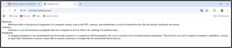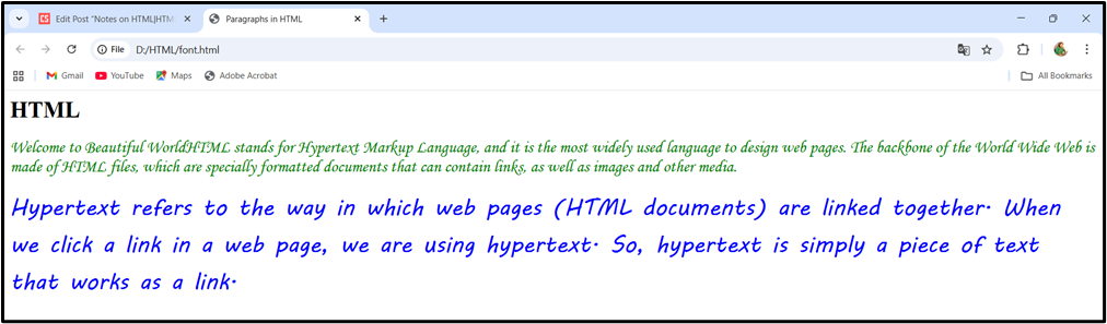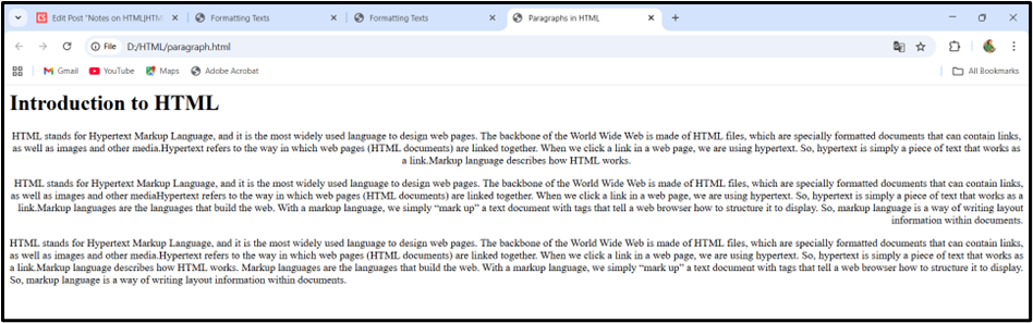 Elements and Tags: HTML is composed of elements, which are defined by tags. For example, <p> is a tag that defines a paragraph, and <h1> defines a top-level heading.