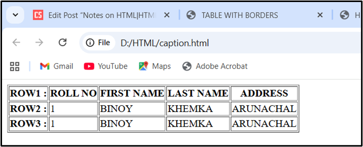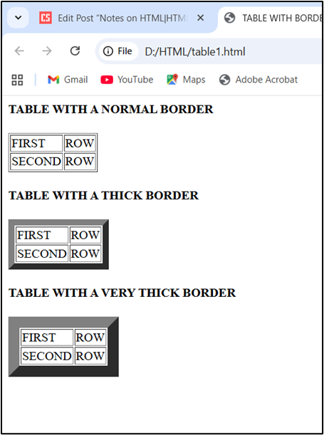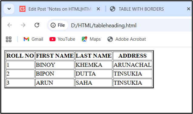 By default, the table does not contain a border. To include a border to the table, specify a BORDER attribute inside the <TABLE> tag. The BORDER attribute of <TABLE> tag controls the appearance of the table’s borders or lines. The default border is 0, so if we do not specify a border attribute, the table is displayed without any borders. Sometimes this is useful, but most of the time, we want the borders to be visible.