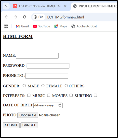 <TITLE> INPUT ELEMENT IN HTML FORM</TITLE>
