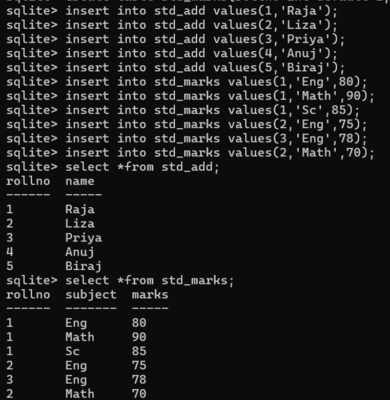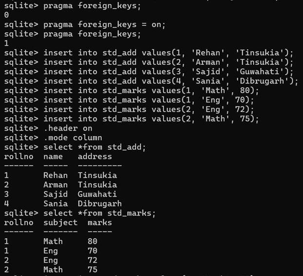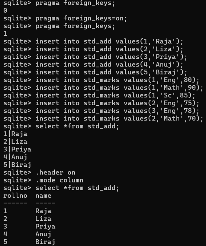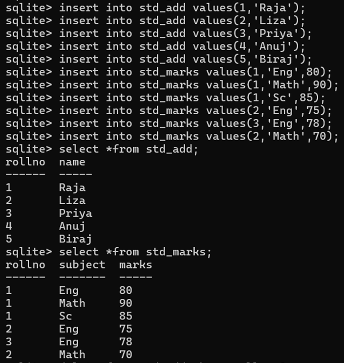 CREATE TABLE STD_MARKS (Rollno INT, Subject TEXT, Marks INT, FOREIGN KEY(Rollno) REFERENCES STD_ADD(Rollno));