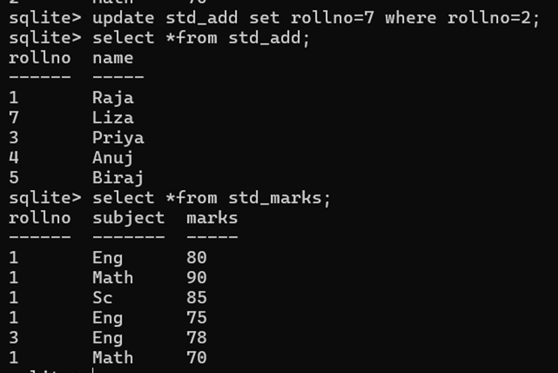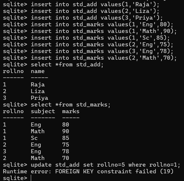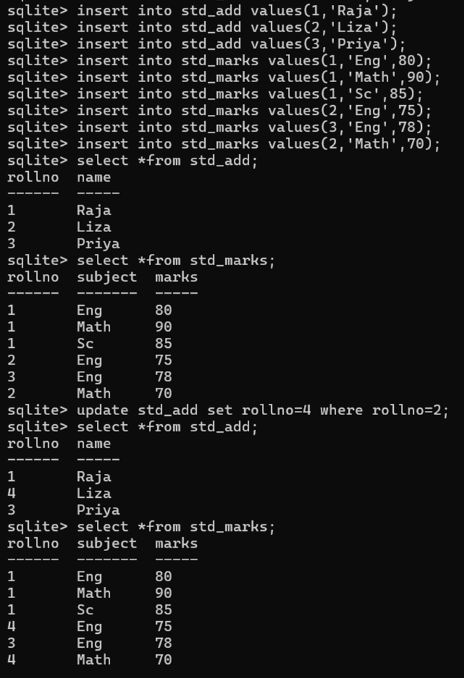 create table std_marks(rollno int, subject text, marks int, foreign key(rollno) references std_add(rollno) on update cascade);