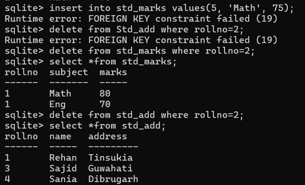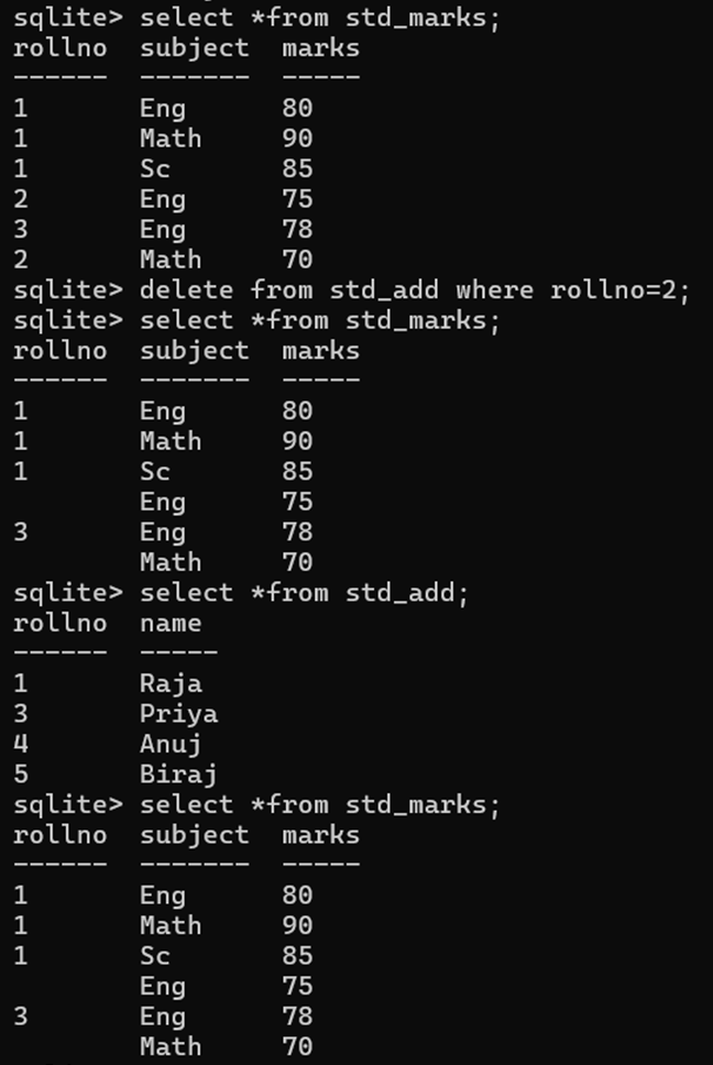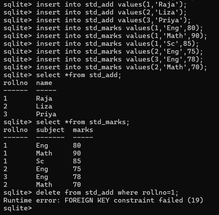 create table std_marks(rollno int, subject text, marks int, foreign key(rollno) references std_add(rollno) on delete cascade);