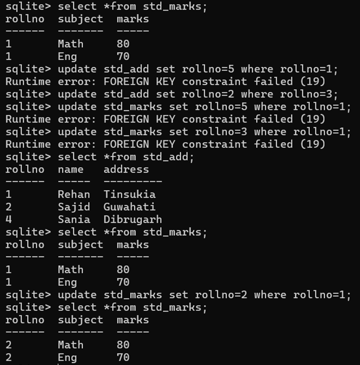 create table std_marks(rollno int default 1, subject text, marks int, foreign key(rollno) references std_add(rollno) on update set default);