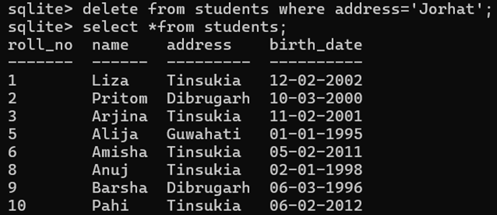 (vi) Delete all the records from the table where address has the value ‘Jorhat’.