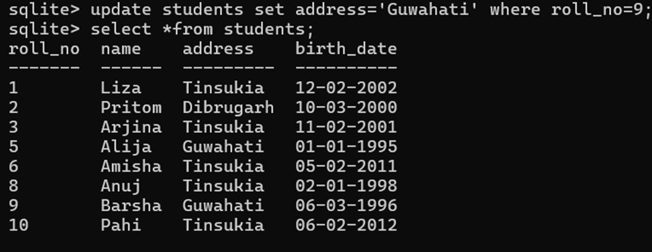 (vii) Change the address of roll number 9 from Dibrugarh to Guwahati.