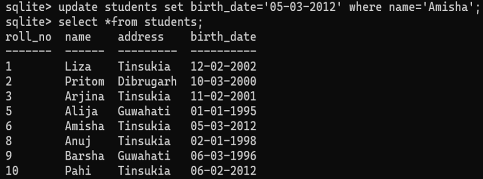(viii) Change the value of birth date column to ‘5-3-2012’ where the name column has the value ‘Amisha’.