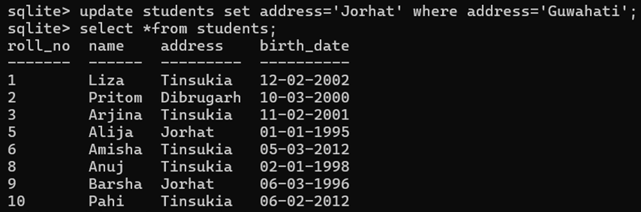 (ix) Change “Guwahati” to “Jorhat” in the address column in students table.