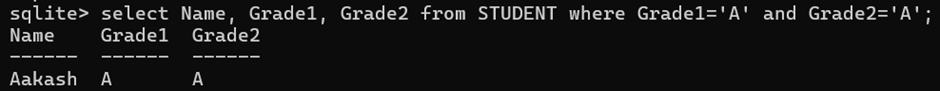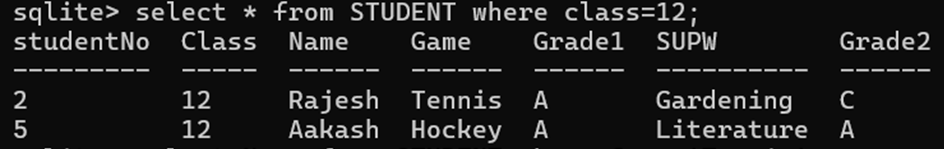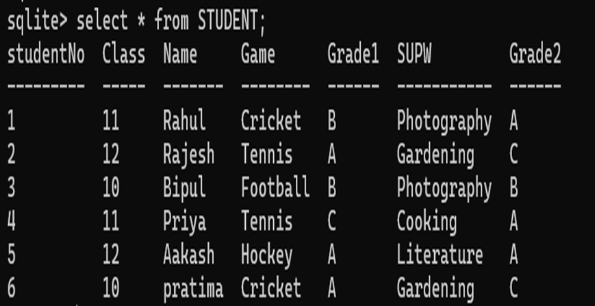 (vi) Display the name, grade1 and grade2 of the students who are getting grade ‘A’ in both Game and SUPW.
