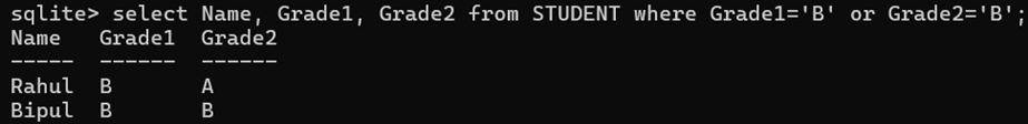 (v) Display the name, grade1 and grade2 of the students who are getting grade ‘B’ in either Game or SUPW or both.