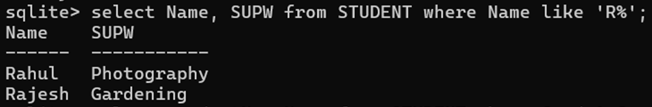 (viii) Display the name and SUPW of the students whose name starts with ‘R’.