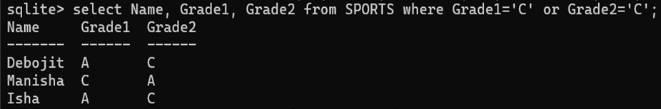 (i) Display the name, grade1 and grade2 of those students who are getting grade ‘C’ in either Game1 or Game2 or both.