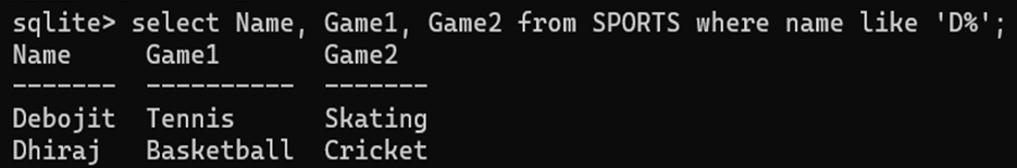 (iv) Display the names and games (Game1, Game2) taken by the students whose name starts with ‘D’.