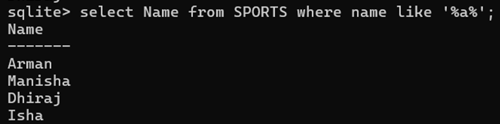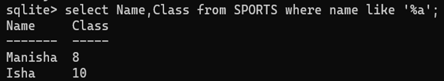 (v) Display the name and class of those students whose name ends with ‘a’. Or, display the name and class of students whose name contains ‘a’ as the last alphabet.