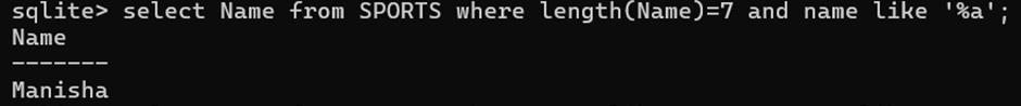 (xi) Write an SQL query to find those students whose name ends with ‘a’ and seven character long.