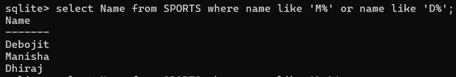 (xii) Display the names of the students whose name starts either with ‘M’ or with ‘D’.