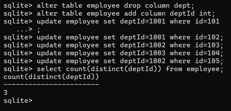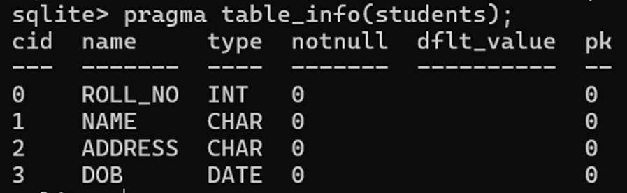 We can also use PRAGMA command with the table_info() function to get the details and description of a table. This SQL query returns a result set containing detailed information about each column in the specified table. The result set typically includes columns like cid (column ID), name (column name), type (data type), notnull (whether it’s nullable), dflt_value (default value), and pk (whether it’s part of the primary key).