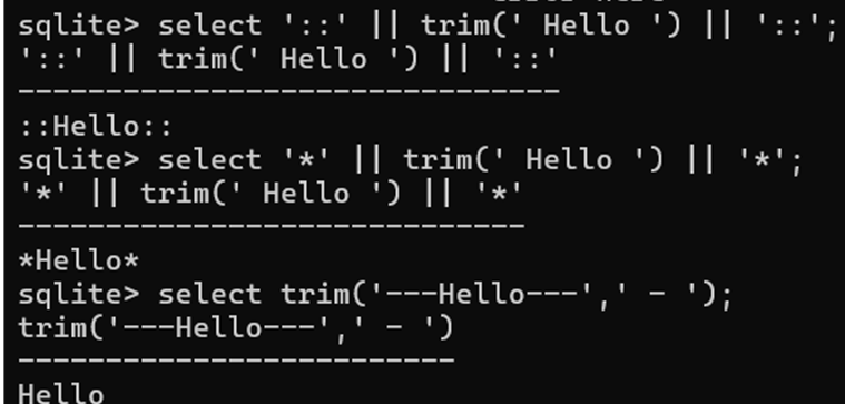 In SQLite, the TRIM() function removes characters from both the beginning and end of a string. By default, it removes spaces, but we can also specify a set of custom characters to remove. The TRIM() function will clean up any whitespace at the start and end of a string.