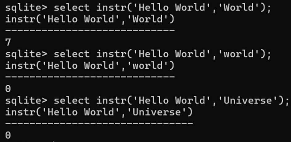 The INSTR() function in SQLite finds the first occurrence of a substring within a larger string and returns its position. If the substring is not found, the function returns 0. INSTR() is case-sensitive.