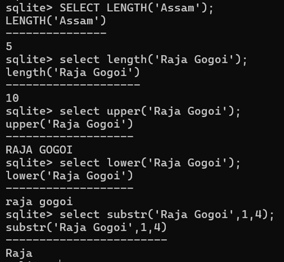 SELECT LENGTH(‘Assam’);