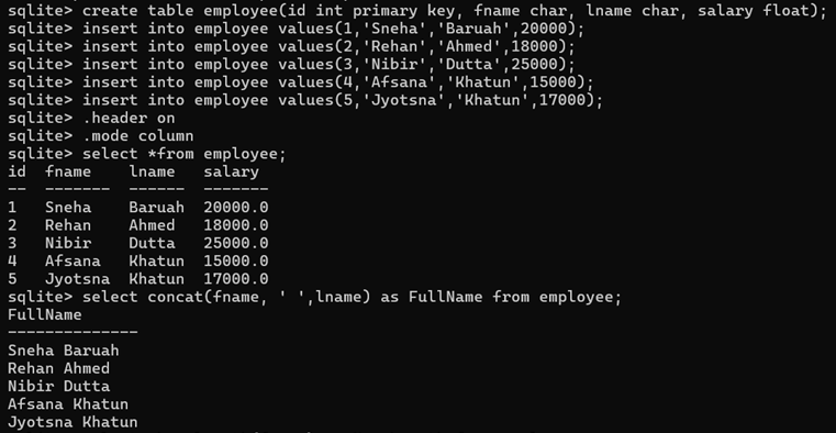 SELECT CONCAT(fname, ‘ ‘, lname) AS FullName FROM Employee;