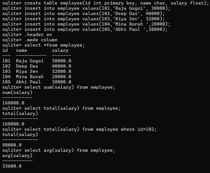 Return data type: TOTAL() always returns a floating-point value. SUM() returns an integer only if all non-NULL inputs are integers; otherwise, it returns a floating-point value.